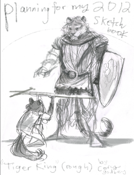 From Cory: I'm in the midst of producing my yearly sketchbook of all new work titled Menagerie. The 40+ page book will feature drawings and sketches of animals and dragons in sometimes dramatic, sometimes operatic situations. Currently I'm doing study drawings of all the pieces. This is basically me working out all of the tigers and bears and creatures that will populate this new book.
