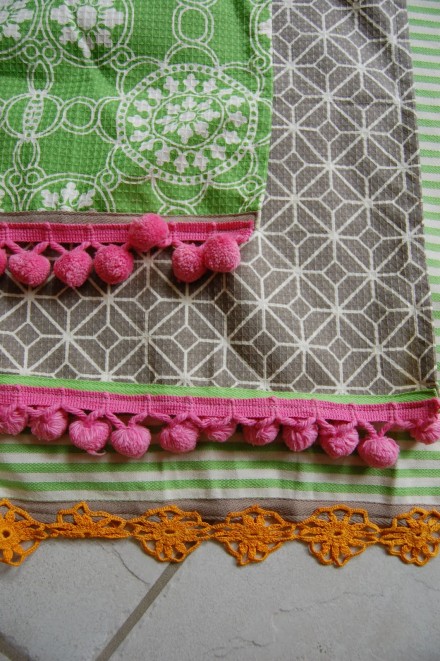It's fairly easy to find nicely patterned cloth napkins on the cheap, but they still lack the punch of the napkins found in high end boutiques and kitchen stores. The Fab Miss B found these inexpensive napkins at Target and quickly spruced them up with thrifted pom pom and lace trim.