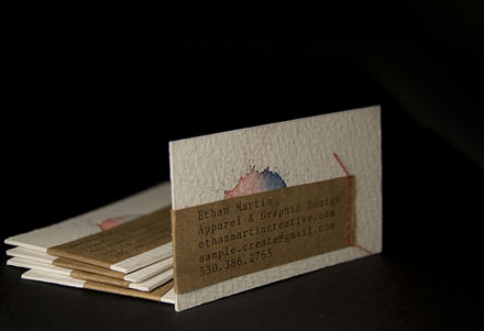 Watercolored card with the printed info stitched on. By Ethan Martin Have you designed a unique business card? We'd love to see it!