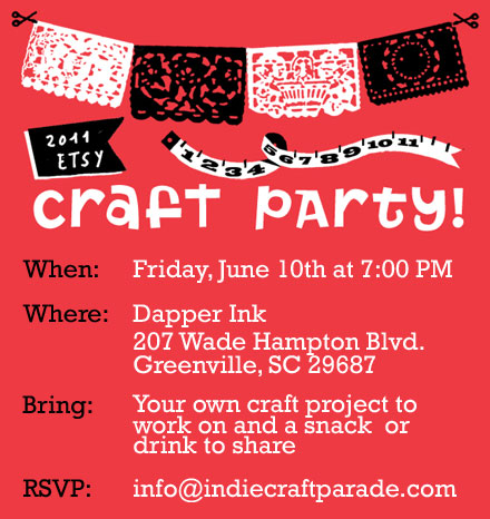 Indie Craft Parade is co-hosting the Greenville branch of Etsy's second global craft party. This Friday, June 10, people all over the world will gather for a evening of spontaneous creating. If you live in the Greenville area, please join us for the party. We'll be meeting from 7:00 to 10:00 at Dapper Ink, located at 207 Wade Hampton Blvd, Greenville, SC 29609. Bring a your own craft to work on and a snack or drink to share. Please RSVP at the Indie Craft Parade Facebook Page.