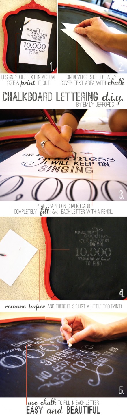 1. Chalkboard spray paint is a total joke. Just use flat black paint and mix in a tiny bit of clear gesso or unsanded tile grout. I didn’t try the paint can variety. Maybe it’s amazing?2. Really, really, really cover the paper with chalk. It will save you so much time in the long run.3. You might want to do a few words with larger text… not going to lie, this took quite a while because my text was so small (and I’m a bit of a perfectionist.)4. A small paintbrush + water is like a magic eraser.