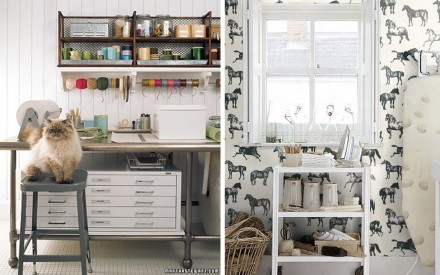 Lovely craft organization and monochromatic wallpaper...but with ELEPHANTS!