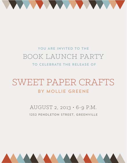 If you're in Greenville, you don't want to miss the official launch party for Sweet Paper Crafts. Everyone is invited to join the celebration! Mollie will be welcoming guests, signing books, displaying some of her latest paper crafts, eating cupcakes, and showing off her adorable baby. See above for all the details. There's a lot happening in The Village that night (First Fridays, food trucks, artist studios and galleries open), so drop by Mollie's party and then keep the fun going!