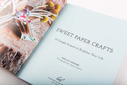 Sweet Paper Crafts, published by Chronicle Books, is a collection of 25 wonderful paper project tutorials. Mollie Greene has a fabulous knack for bringing life to bits of paper, whether through a dancing mobile or a celebratory garland flung over a doorway. These aren't your Aunt Edna's scrapbook projects, every one of Mollie's unique designs embodies her special flair for bringing life to bits of paper. Anyone can create paper art with these wonderful projects, from the eager beginner to experienced crafter. The simple, clear instructions and step-by-step photos in addition to the one-of-a-kind designs make this book a real treasure!