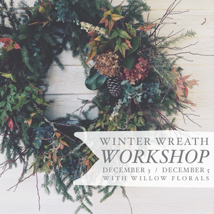 We’re getting giddy about our upcoming DIY class with the fabulous Julie Dodds of Willow Florals. Her distinctive floral styling is a feast for the eyes, and she's ready to share her tips and tricks with you! Julie will guide the class in making an incredible winter wreath from fresh pine branches and other natural elements. All the supplies will be provided, and at the end of the night you'll leave with a big beautiful wreath to take home and enjoy!