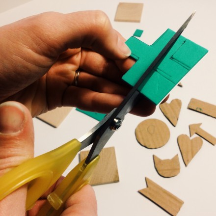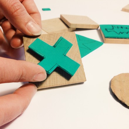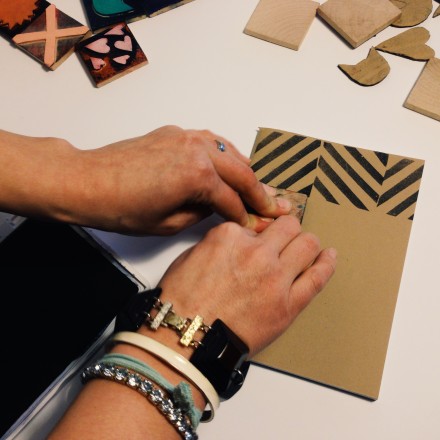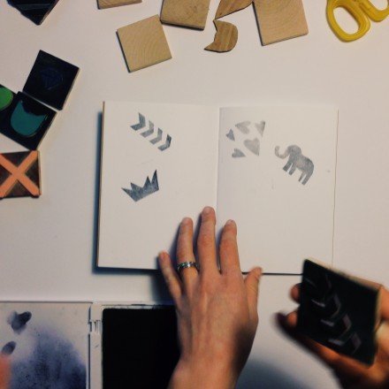 -Adhesive backed foam sheets-2 inch by 1/4 inch wood squares-Scissors-Pen-Ink pads-Paper (wrapping paper, notebook, gift bags, etc.)