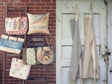 Hawks & Doves is a NC based maker who repurposes found materials in conjunction with both new and dead stock American made textiles and USA leather. We're dying over the feed sack pillows and especially those gorgeous aprons.