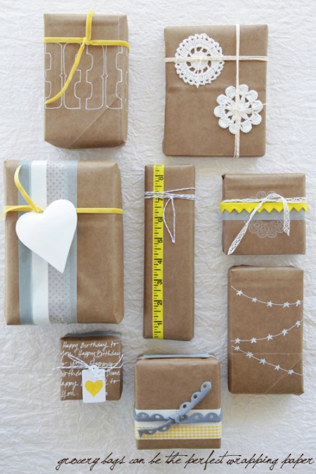 Recycling paper bags and other odds and ends into cute, cute wrapping paper; Courtesy of A Creative Mint.
