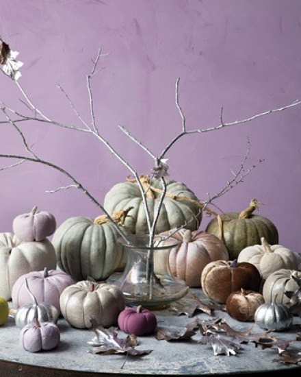 Fabric pumpkins from ever creative Martha Stewart team. I love the color combination of plum, velvet, and metallic fabrics.
