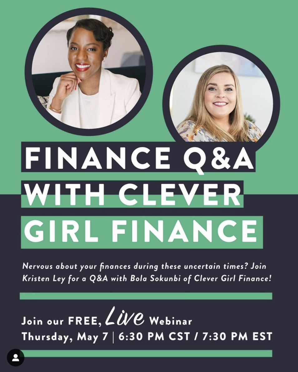Kristen Ley is hosting a free hour-long Q&A with @bolasokunbi, Author and Founder of @clevergirlfinance. Submit your questions ahead of time via Direct Message or email or ask for advice anonymously during the event.