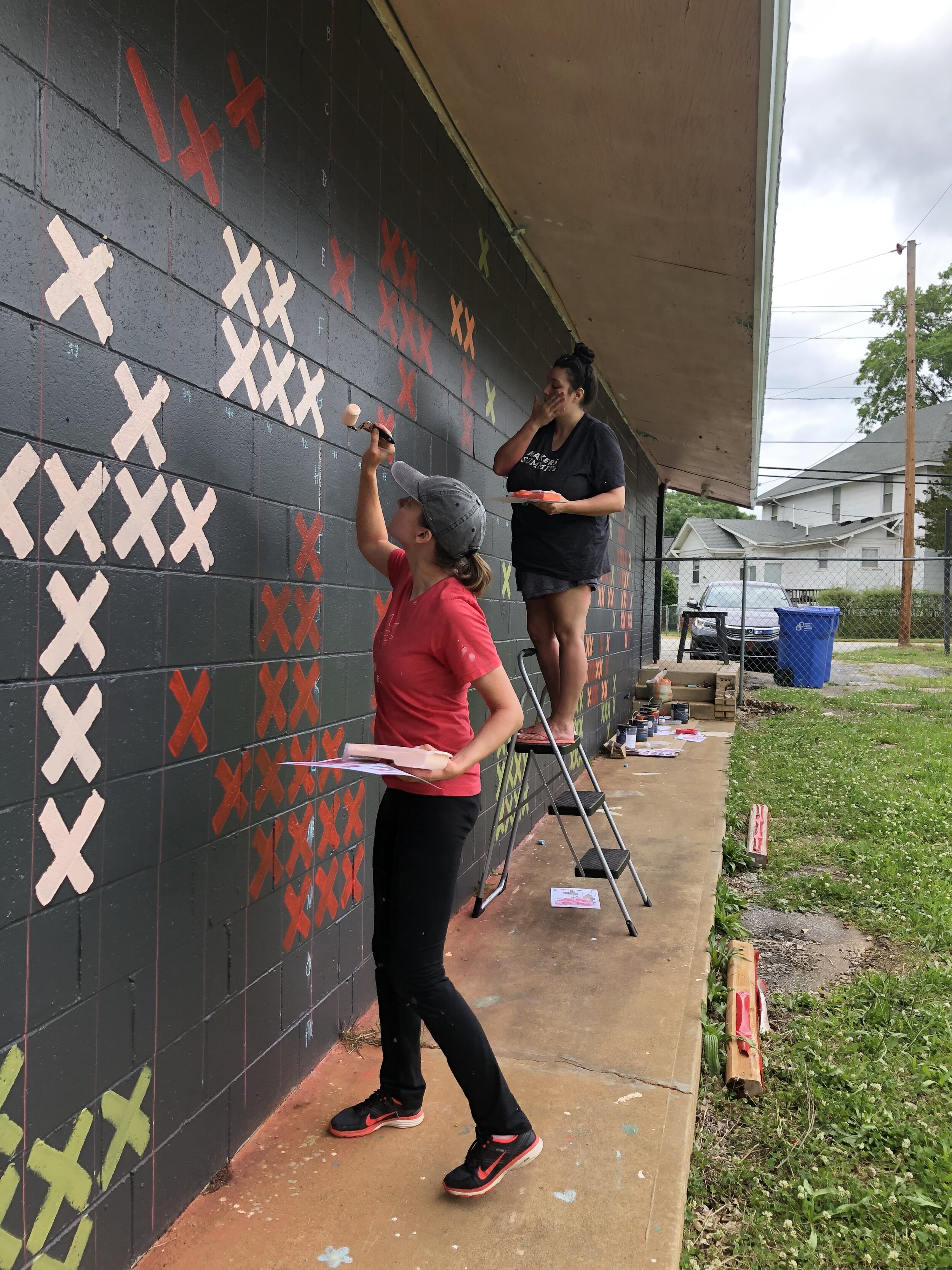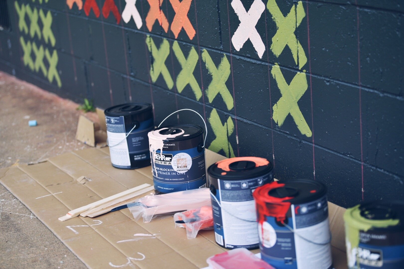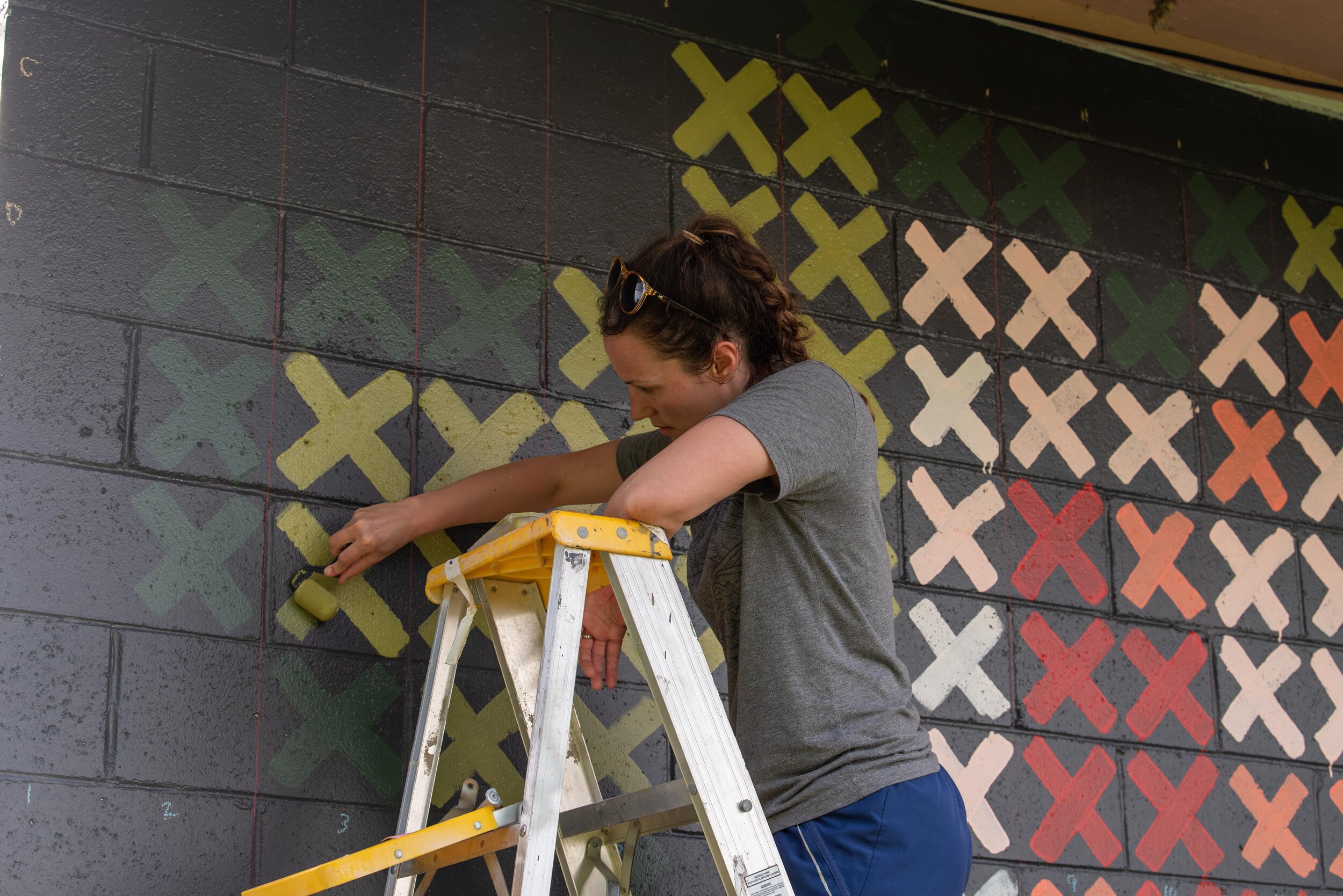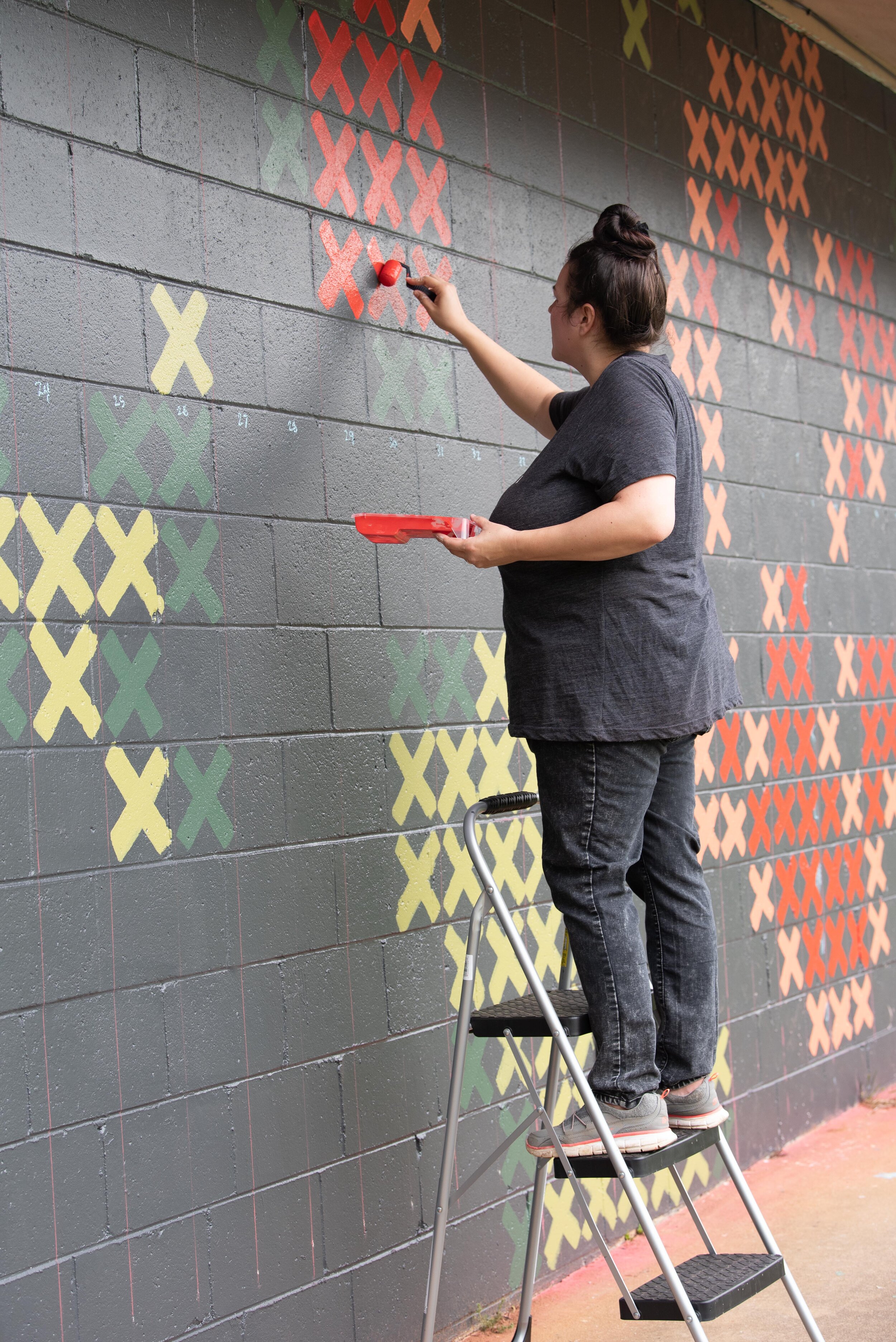 Working within the constraints of our 56-foot-long wall, we created a design that would capitalize on the built in (pun intended) structure of the cinderblock. We treated the wall like a giant piece of fabric, painting Xs to create an image.