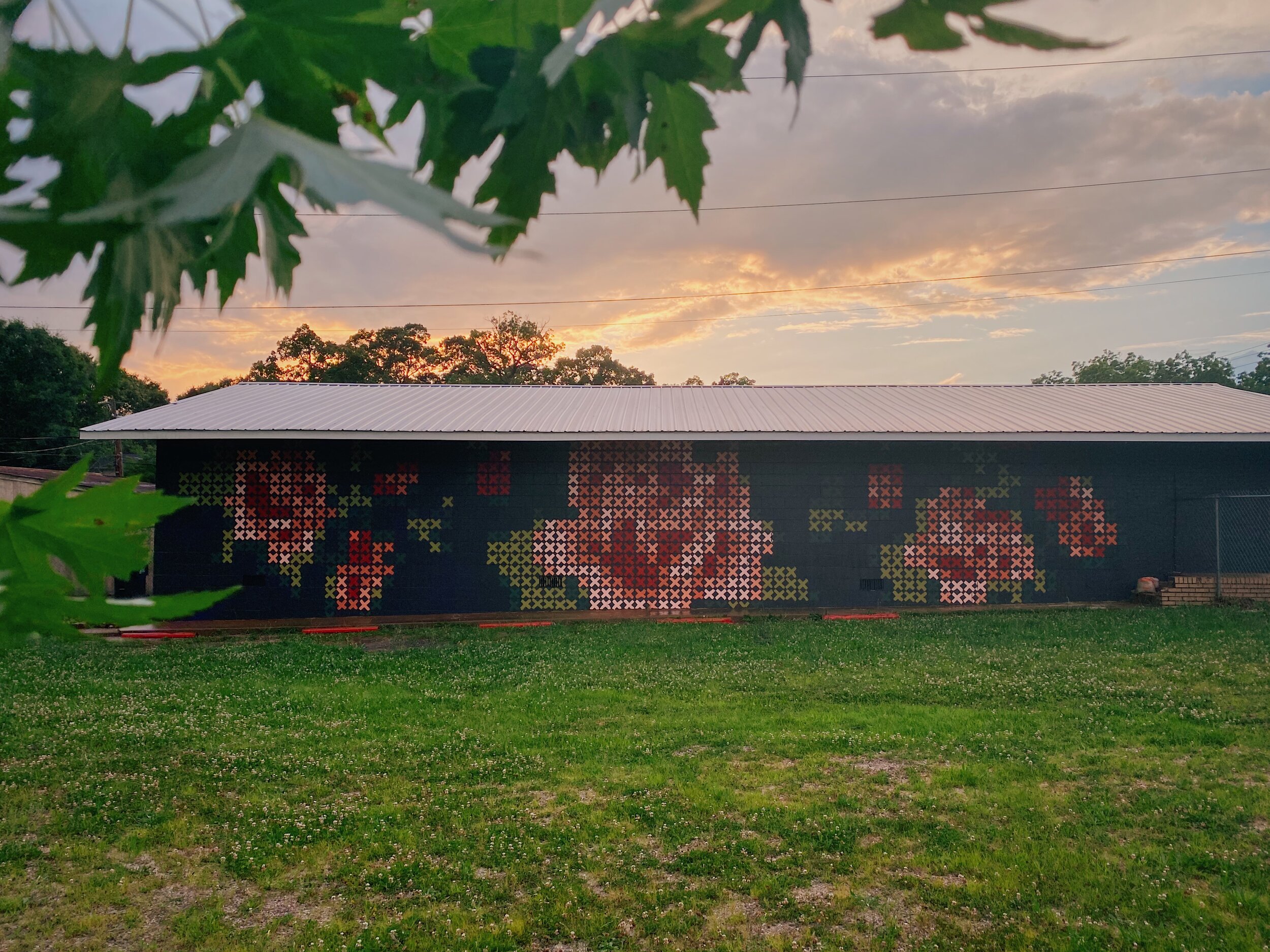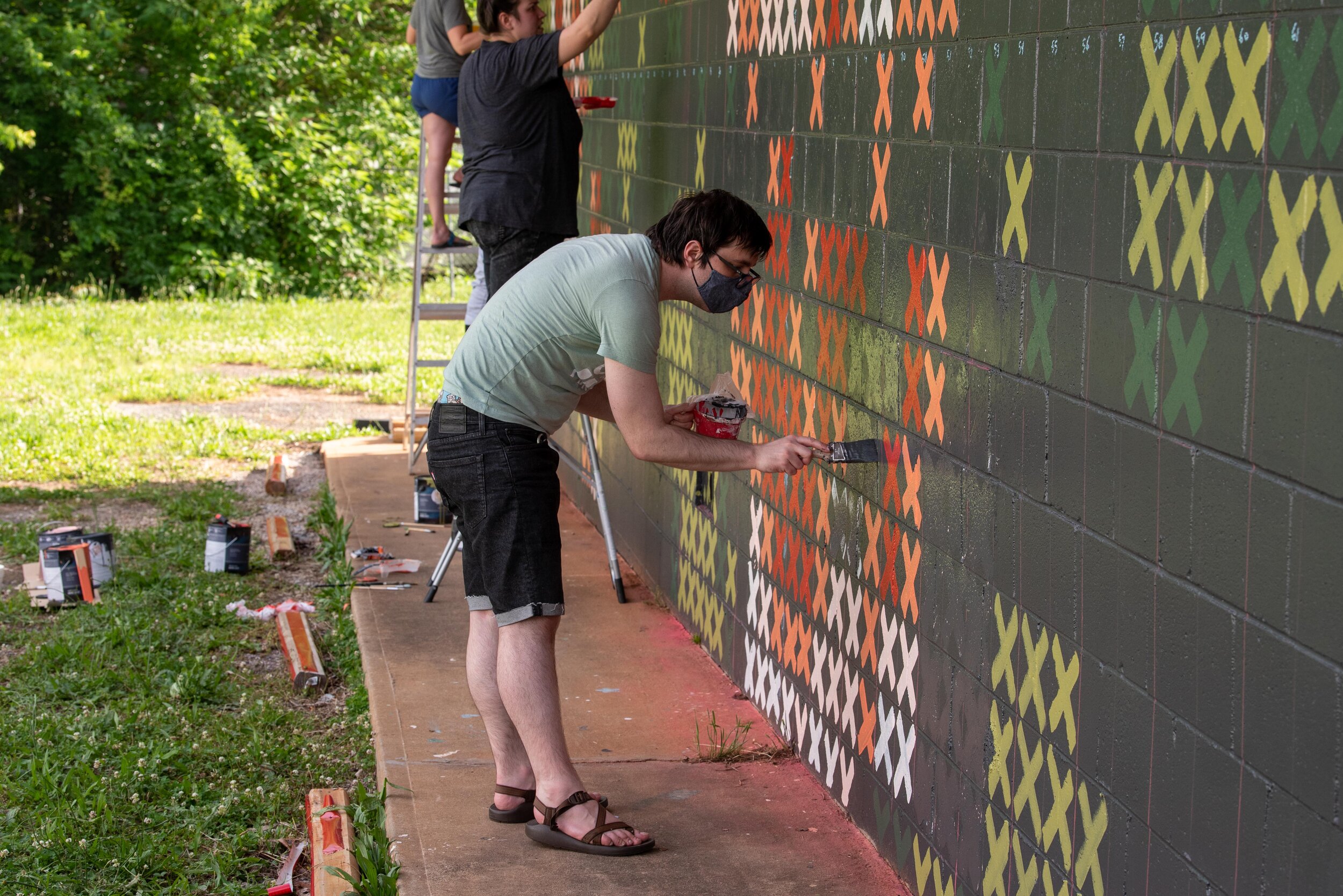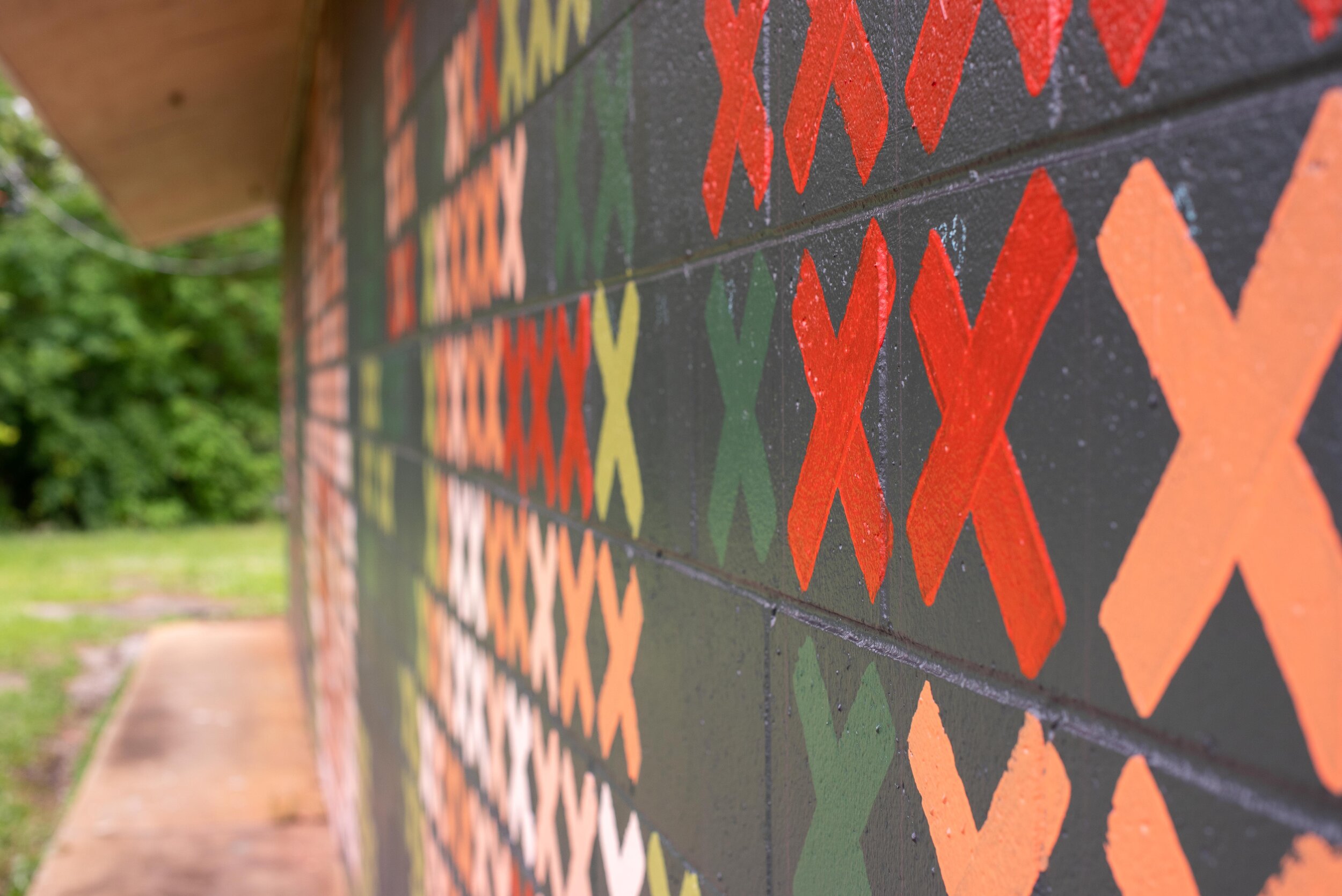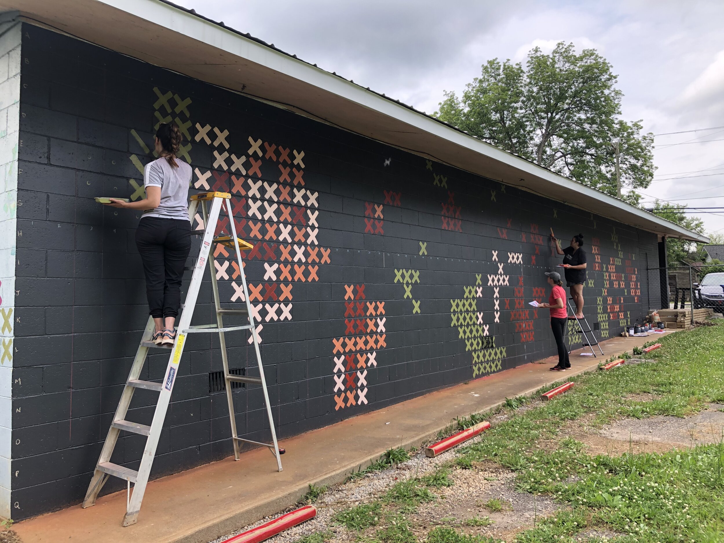 Working within the constraints of our 56-foot-long wall, we created a design that would capitalize on the built in (pun intended) structure of the cinderblock. We treated the wall like a giant piece of fabric, painting Xs to create an image.