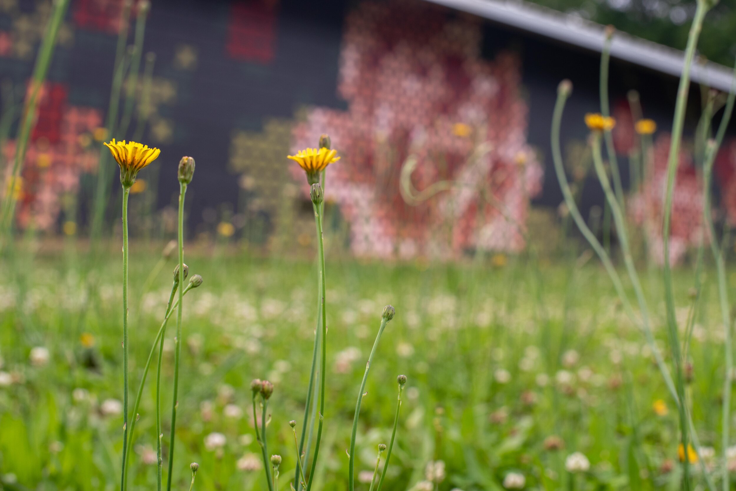 The end result is a large scale floral cross stitch piece, with each ’stitch’ spanning the height of a cinder block.
